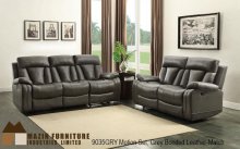 Cool cushioned backs and plush overstuffed headrests adorn this attractive two-toned charcoal grey reclining loveseat and sofa. Both streamlined and functional, the bonded leather set has smooth manual recline, center storage console and cup holders. Also available in Brown Bonded Leather