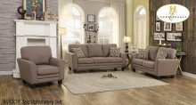 The Urich Collection. Stitched tufting and track arms, along with the segmented look of the seating's support rail lends to the streamline look. The plush seating is covered in Brown Leather Bonded Match.