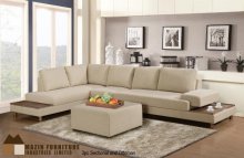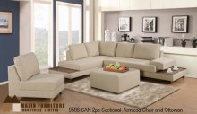 Chic form and sophisticated function are reflected in this modern sectional design. The cool sand color linen-like fabric is complemented by light oak wood tray and legs. A seemingly floating arm on one side and a functional table surface on the other provide built-in surfaces for entertaining. Armless sections can be added to extend the sofa seating. **Large square Ottoman is optional**