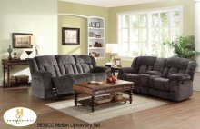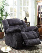 The Laurelton Collection. The double glider reclining loveseat's center console features dual cup holders and hidden storage. Plush textured charcoal microfibre covers the amply appointed seating group.