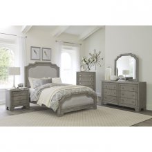 In the Colchester Collection, a modern take on traditional design creates an elegant profile for your bedroom’s décor. The driftwood gray finish of the collection is complemented by the gray fabric and nailhead accent of the California King headboard and footboard.