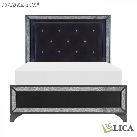 Glamour abounds with the addition of the Salon Collection to your bedroom. The black pearlescent finish is enhanced by the silver glitter trim that frames the bed's profile. The California King headboard features a padded faux leather insert that is accented by faux crystal button-tufting and LED-backlighting, that serves as the centerpiece of this sparkling collection.