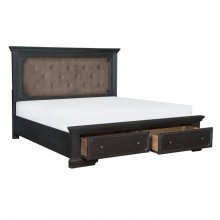 Rustic styling intersects with traditional lines in the design of the Bolingbrook Collection. The charcoal finish over pine solids and engineered pine veneer creates a warm complement to the elegantly framed queen platform storage bed. Providing subtle contrast to the groups finish is the button tufted neutral tone fabric headboard insert. Knob hardware subtly accents the footboard’s drawer fronts.