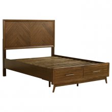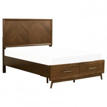Danish mid-century modern design is well exemplified in the Raku Collection serving as stylish addition to your bedroom décor. Warm walnut finish-over the walnut veneer. The queen bed features a wood panel headboard and storage footboard.