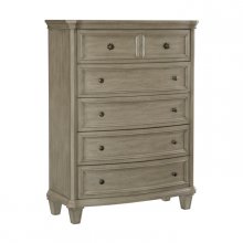 Designed for the modern traditional home, the Vermillion Collection is a light and airy take on the themes of classic style and refined elegance. The subtly bow-fronted chest features knob hardware and traditional framing that is enhanced by the distinct grain of oak veneer with subtle gray cashmere finish and walnut inlay.