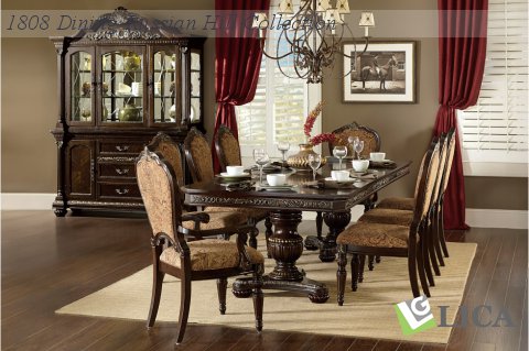 Blending the classic aesthetic of traditional design is the Russian Hill Collection. The nod to Old World styling comes in elements such as dental, rope and bead molding, shell motifs and faux marble accent, this dining collection goes above and beyond to create the desired look. An elegant double pedestal table serves the main course of this refined collection. Acanthus scroll design encompasses the table apron and complement the wood frame fabric chairs. The stately china stands as the focal point topped with a carved shell accent and elaborate acanthus scroll design. The server features faux marble top, glass and wood door fronts, wine storage as well as service drawers. Further lending to the design of the china and server are the fixed antique finished hardware and pilaster accenting in the style of Corinthian columns. The Russian Hill Collection is offered in a traditional warm cherry finish with gold tipping solidifying the interpretation on traditional décor.