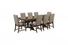 The traditional styling that comprises the design of the Stonington Collection creates an elegant country look for your dining room. Oak and walnut-inlay veneers are finished in a 2-tone brown and charcoal creating a perfect contrast that highlights the distinct patterns of each wood’s grain. A self-storing extension leaf allows for both convenient placement and expansion of your table to fit your desired number of guests. The trestle base that supports the tabletop features dramatically curved posts that lend to the classic design. The wood-framed armchair and side chair feature beige fabric seats and backs with accenting nailhead trim. Providing additional display and storage space within your dining room is the available server. Antique brass-finished ring-pull and knob hardware front the drawers and doors of the server.