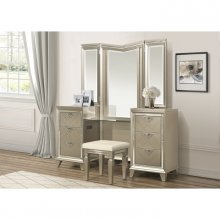 Dramatic from every angle, the Bijou Collection presents as a glamorous statement to the décor of your boudoir. The vanity stool features a champagne tone faux leather padded seat and champagne-finished wood framing.