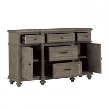 The solid transitional styling of the Cardano Collection creates an impactful design presence in your dining room. Utilizing distinct accent techniques – plank effect, rasping, saw marks – and pairing them with traditional framing and a light finish – brown wood over acacia veneers – creates a collection that is worthy of your dining room. Pewter-finished hardware mounted on the functional drawers and doors of the server provides a subtle contrast to the wood’s finish. The server allows for convenient access to your decorative tabletop accessories, while the buffet server, with its wood door and drawers.
