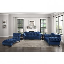 The exquisite glamour that accents your home will pair perfectly with the Rosalie Collection. The dramatic curves of the sofa give way to traditional accent in the form of rolled arms, button-tufting, turned legs -with black finish- and nailhead trim. The velvet covering of the collection is offered in navy to perfectly complement your living space.