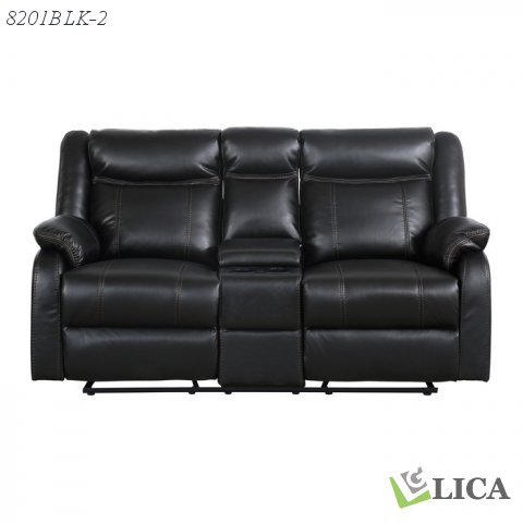 Plush seating with well-appointed features makes the Jude Collection a comfortable and functional addition to your living room. Black premium faux leather coverings for a bold, yet, neutral statement. Manual motion mechanisms operate with the pull of a side-mounted tab, that once engaged, take you from seated to reclined in an easy motion. The dual glider reclining ends of the love seat flank a center mounted console with storage and cup-holders.