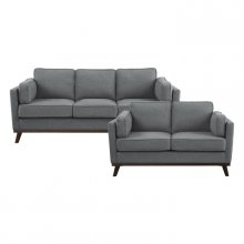 The sleek styling of Mid-Century modern design was utilized to create the Bedos Collection. The love seat is covered in blue fabric lending a distinct pop of color to your living room. The wood base rail that trims each piece in the collection is supported by wood legs. Rectangular bolster style pillows create a comfortable buffer between you and the arm of the love seat. Coordinating love seat and chair are available. The collection is also available in gray fabric.