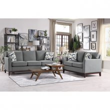 Inspired by classic frames of the past, the Blue Lake Collection is a study in casual sophistication. The love seat is covered in gray fabric that is enhanced by the modern geometric cresent pattern of the toss pillows. An exposed wood base rail, welting and flared arm lend considerable style to the tailored profile of this classic collection. Reversible seat and back cushions further enhance the functionality.