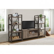 Gunmetal finish provides distinct contrast to printed brown wood grain melamine veneer in the Dogue collection. The 4-shelf bookcase features open display shelving.