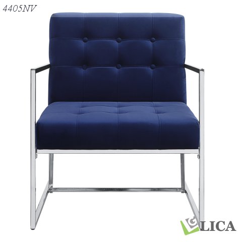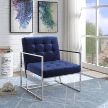Does your room need a touch of glam? If so, the Delia accent chair may be exactly what you’re looking for. A unique continuous geometric frame evokes the architectural flare of the Art Deco era. Outfitted with foam padded seats and back cushions in plush velvet upholstery, you’ll have both style and comfort. Tufted button detailing and a bright chrome finish complete the look of the Delia chair, making it a delightfully luxe addition to any room. Available in grey or navy.