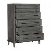 Modern convenience is paired with transitional style to create the versatile look of the Wittenberry Collection. The chest’s gray finish over okume veneer is complemented by the dark bronze finished knob and bar hardware that fronts the framed drawers of the piece.