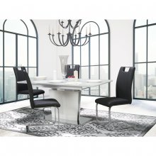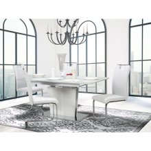 - Bright white and polished metal gives table an architectural feel and brings light to the dining area