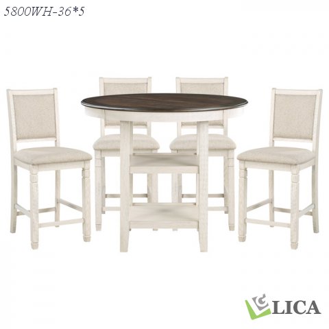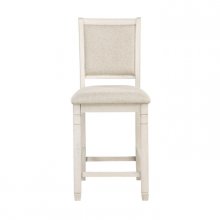 The transitional style of the Asher Collection creates a versatile platform to inspire your casual dining room décor. The round counter height table’s support base features a display shelf that allows for quick and open access to your tabletop accessories. The antique white finish over acacia veneer serves to highlight the wood’s grain while allowing for maximum versatility in decorative accenting. The coordinating wood-framed counter height chairs feature light brown fabric seats for complementing contrast.
