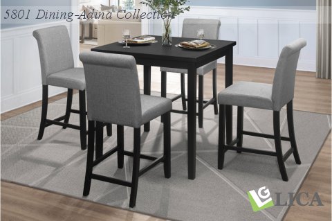 The Adina Collection’s transitional style makes it a perfect fit for your casual dining space. A black finish is utilized over the ash veneer of the counter height leg table and legs of the coordinating counter height chairs. The chairs feature padded seats and backs that are covered in gray fabric, providing neutral complement to your home’s décor.