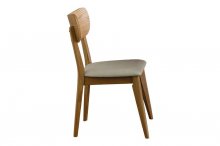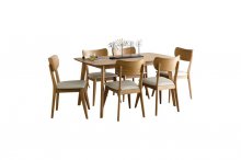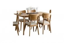 Drawing inspiration from Danish mid-century modern design, the Anika Collection is a stylish addition to your home’s dining space. The gentle curve of the table top is perfectly accentuated by the accompanying wood framed chairs, all featuring legs that are the signature to this classic look. Off-white bi-cast vinyl padded chair seats provide stark contrast to the light ash finish over ash veneer, furthering the contemporary design. The accompanying server features brushed nickel hardware and soft close mechanisms on the doors and storage drawers for quiet and sure closure.