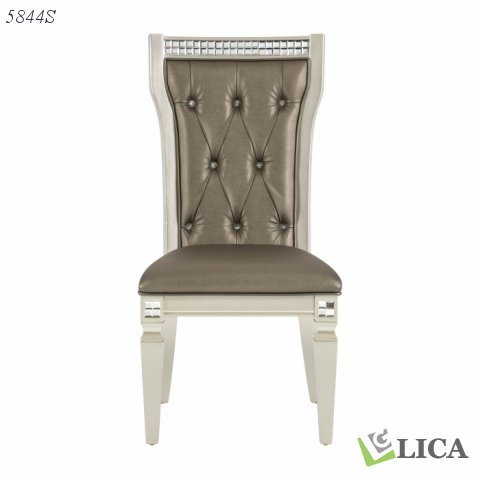 Radiating the iconic beauty of glamorous styling, the Juliette Collection is an elegant addition to your dining room. Acrylic crystals center the tufted chair backs, their facets refracting the light of your space, while the silver finish of the collection is reflected in the mirror trim that defines the profile of the chair.