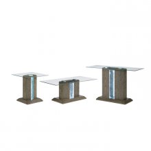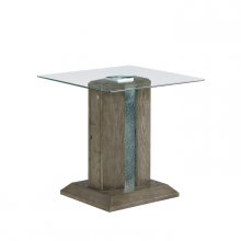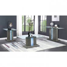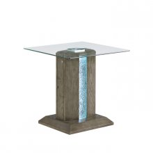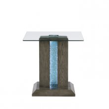 Light up your living room with the contemporary styling of the Spectra End Table - literally! Combining the classic look of a grey wood finish with a modern profile crowned by a clear tempered glass top, the Spectra brings more than just good taste to your home. The pedestal base features sophisticated embedded etched glass panels that showcase 3-way adjustable cool white LED lighting, all controlled by a touch of the button located on the table's side. Create a unique ambience while entertaining or simply ensure your living room doesn't get too dark; either way, the Spectra will enhance your décor enormously.