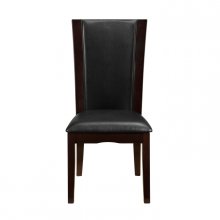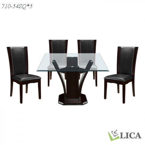Daisy Collection combines superb visual appearance and fine quality that you need in your dining area. Three distinct elegant flared tulip bases support beveled glass tabletops on the square traditional dining height tables. Additional offering is the trestle table with black glass insert. Dining height chairs feature clean lines and sleek curves; available in both white faux leather and dark brown faux leather. The set is constructed of hardwood solids and veneers in a refreshing espresso finish.