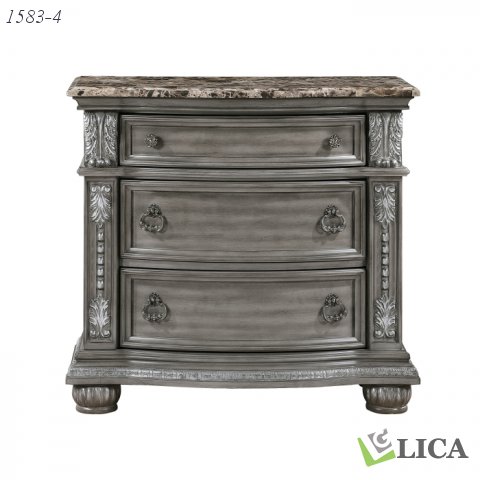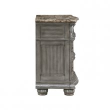 The luxurious grandeur that permeates the design of the Bennington Collection is an amalgamation of classic accenting and traditional lines. Carved bun feet, acanthus leaf carving, bead molding, and elegant framing account for the beautiful profile that defines the nightstand’s design. Antique pewter-finished knob and ring pull hardware fronts the drawers, and marble tops the piece. The gray finish, over acacia veneer, features subtle silver tipping for final luxurious accent.