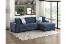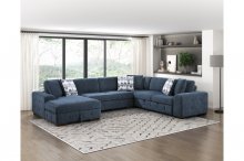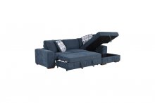 The substantial seating space of the Raife Collection creates a comfortable spot perfect for entertaining or just relaxing. The sectional allows for multiple configurations with individual components consisting of; a left-side chaise, right-side chaise, armless two-seat unit, corner unit, left-side two-seater and right-side two-seater – each with a pull-out bed, as well as one centimeter of memory foam on the seats and storage ottoman. The pull-out bed, stored beneath the two-seat unit, pops up to create ample space for full-leg extension. The lift-top seat of the chaise unit opens to reveal hidden storage perfect for blankets and pillows. Furthering the functional capabilities of the collection is the ottoman, its seat rising to reveal discrete storage. Blue textured fabric upholstery covers the seating group.