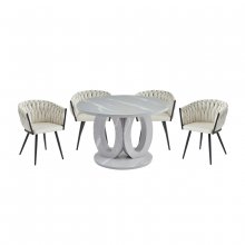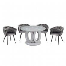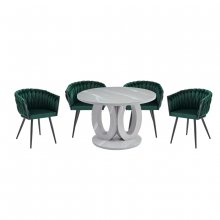 Introduce a little artistry to your dining room with the exquisitely rendered Skye 5-piece Dining Set. This contemporary collection is a fantastic way to spruce up your modern dining area thanks to its unusual profile. The table’s sculptural pedestal features two open ovals atop a circular base that echoes the round shape of the larger tabletop above. A grey and white faux Carrara marble finish further emphasizes the table’s sculptural appearance, giving it the timeless look of carved stone. The tabletop is protected by a layer of tempered glass, adding a glossy lustrous effect that is far easier to wipe down than true marble. Available in grey, blue, green, or beige, the accompanying arm chairs feature a barrel design cloaked in soft velvet upholstery that weaves around the frame with a unique braided effect. The contoured back and arms are padded with foam, as is the seat, providing ample cushioning and support. Sturdy framing guarantees long-lasting durability, allowing the Skye Collection to effortlessly blend practicality and elegance as it becomes your dining room’s new statement piece.