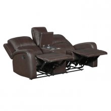 Experience unparalleled comfort and convenience with this luxurious double reclining loveseat, featuring a practical center console. Constructed with a robust frame of solid wood and plywood, reinforced with metal in the seats, this loveseat ensures exceptional durability and long-lasting stability. Sink into high-density foam padding laid over responsive pocket coils, providing a supremely comfortable and supportive sit for both occupants. Sumptuously upholstered in top-grain leather where your body touches for a premium feel and elegant look, complemented by skillfully matched faux leather on other areas. The integrated center console offers convenient storage and includes two cup holders, perfect for keeping drinks and essentials within reach. With easy manual tab-pull reclining motion and wall-hugging design that only requires 3 inches of back clearance, this loveseat is the ultimate blend of sophisticated design, practical amenities, and superior comfort for any modern living space.