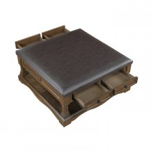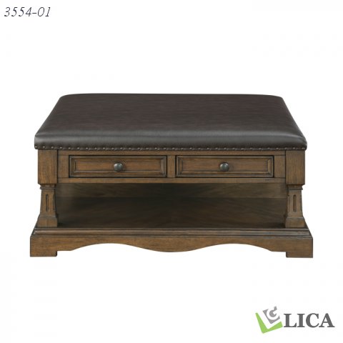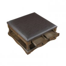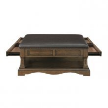 Enhance your living space with this multi-functional rustic square cocktail table that doubles as an ottoman. Crafted from a blend of cherry veneer, wood, and engineered wood with a rich brown finish, this piece features a plush faux leather upholstered top adorned with classic nailhead trim, providing a comfortable place to rest your feet. The table is designed for maximum storage and convenience, boasting four smooth-gliding dovetail drawers and a spacious low open shelf, perfect for keeping your living area tidy. With its elegant turned legs, antique bronze-tone knobs, and easy-rolling casters, this coffee table seamlessly blends traditional style with modern practicality, making it the perfect centerpiece for your living room.