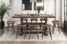 Elevate your dining space with this stylish counter-height collection, blending rustic charm with industrial appeal. The centerpiece is a versatile counter table, crafted from a durable blend of acacia veneer, wood, and engineered wood with a warm brown finish. It comfortably seats up to six and features an integrated black metal footrest for comfort. Pair it with the coordinating counter height stools, which are designed with a sturdy wood frame and ergonomic saddle seats, offering both durability and timeless style for a perfect gathering spot.