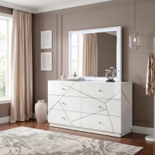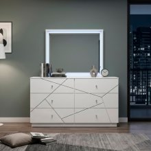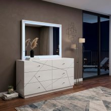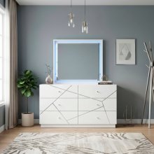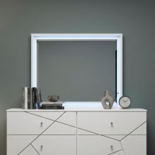 Enhance the light and perceived space in your room with this sleek, rectangular mirror, perfectly sized to sit atop your modern bedroom dresser. The mirror is framed in a crisp white finish crafted from a durable blend of wood and engineered wood, ensuring both style and longevity. What truly sets this piece apart is the integrated LED lighting, which softly illuminates the mirror's border, casting a flattering, ambient glow that is ideal for dressing or simply adding mood lighting to your space. This stunning accent piece instantly upgrades your vanity or dressing area with its bright aesthetic and contemporary illuminated design, making it the ideal complement to your bedroom suite.