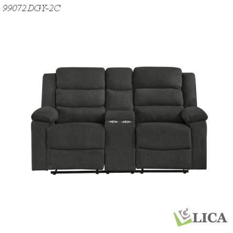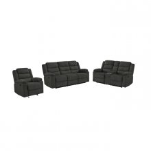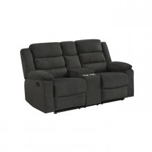 Get ready to snuggle up in style with the Tyrone Collection! This charming console loveseat is the perfect addition to any cozy living space thanks to generously stuffed headrests and plush pillow armrests that invite you to relax and unwind in comfort. With an easy-to-use tab-pull latch mechanism, reclining is effortless – just pull, lean back, and enjoy the ride! This loveseat is particularly convenient thanks to a central console with storage and two cupholders so you can enjoy drinks anytime. Upholstered in extra soft dark grey fabric with a textured appearance and sensation, this seat brings a touch of retro cozy charm to your home. Plus, with durable framing under dense foam seat construction, this loveseat is built to last. Allow the Tyrone to transform your living room into a relaxing haven and treat yourself to a blissful lounging experience.