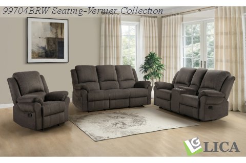 Seeking dependable comfort? Look no further than the Vernier 3-piece Upholstery Set! This collection is finished in soft textured brown chenille fabric and is outfitted with double tab-pull latches so you can stretch out and recline at either end. Overstuffed headrests, supportive backs and seats, and pillow-style cushions on sock arms create a plush relaxation experience with tailored stitching to enhance this seat's visual appeal, not to mention the loveseat's central console with cupholders or the recliner's gentle glider function. Built from solid tropical wood and cushioned with high-density foam over pocket and S-springs, this sofa will maintain its shape and comfort over time. Available in two neutral colours, the Vernier delivers on every level - design, durability, and everyday comfort.