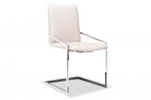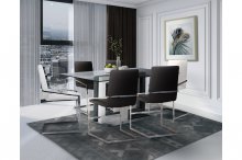 Metal meets wood meets glass; quality craftsmanship meets cutting edge design. The Yves Dining Collection is striking and sophisticated, a functional work of art. Thick bevelled glass sits atop a geometric base in rich grey wood finish and white lacquer, further supported by its sleek metal base. Paired with the sleek contemporary Jasmine Chair; this seat has a continuous chrome base wrapping around the back of the chair and creating a unique visual interest as well as arm support. Easy to clean faux leather fabric has a subtle pebbling effect, available in grey, white or dark charcoal grey.