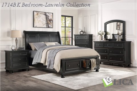Casual transitional styling lends versatility to the placement of the Laurelin Collection in a number of bedroom settings. The black sand-through finish creates a versatile look allowing for placement of the collection in traditional to country casual environments. Antiqued bronze knob hardware punctuates the look of each framed drawer front, providing complementing accent. Hidden drawers in the nightstand and dresser provide discrete storage for your valuables, while the storage drawers of the footboard provide a more visible means of additional storage capability. Bun feet support the case goods and a sleigh headboard finish off the transitional design of the collection.