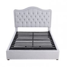 The distinct camelback headboard of the Toddrick Collection provides an elegant focal point for your bedroom. With styling that lends to placement in modern traditional environments, the California King upholstered bed’s profile is defined by nailhead trim, features button-tufting and is covered in gray linen-like fabric for neutral accent to your bedroom’s decor. The platform bed’s low-profile footboard conveniently pulls out to reveal a storage drawer, providing functional space to store your essentials.