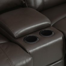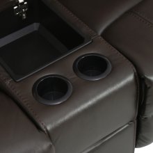 Plush seating with well-appointed features makes the Jude Collection a comfortable and functional addition to your living room. Brown premium faux leather coverings for a bold, yet, neutral statement. Manual motion mechanisms operate with the pull of a side-mounted tab, that once engaged, take you from seated to reclined in an easy motion. The dual glider reclining ends of the love seat flank a center mounted console with storage and cup-holders.