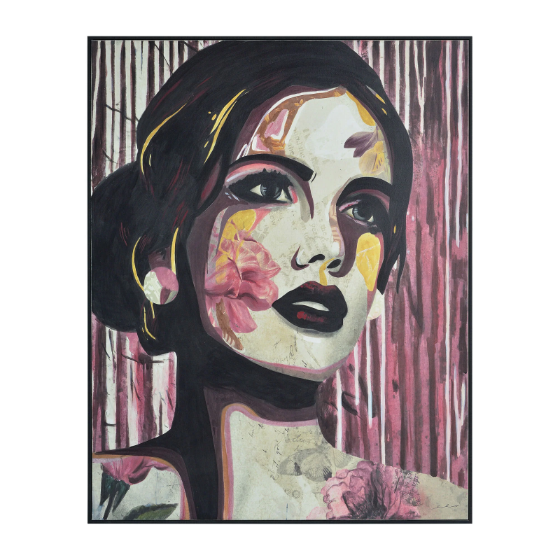A design-forward take on the traditional portrait, this art canvas catches the gaze of a passerby and holds it. Best hung as a focal piece in a living room or entryway, this art painting has the power to set the tone for the entire interior. The warm yet bold palette of burgundy hues is complemented by solid-colored dark walls, furnishings and decor.
