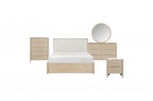 Soft modern lines comprise the design of the Matteo Collection, while convenience features provide functional accent to your bedroom. The light oak finish over oak veneer is complemented by the oyster-hued textured fabric upholstery that covers the padded headboard lending a light and airy aesthetic to your bedroom. Charging ports are conveniently mounted on the back of the marble-topped nightstand, and built-in side shelves of the headboard. Storage space beyond the dresser, nightstand, and chest, comes in the form of the bed’s footboard drawer.