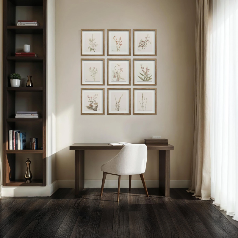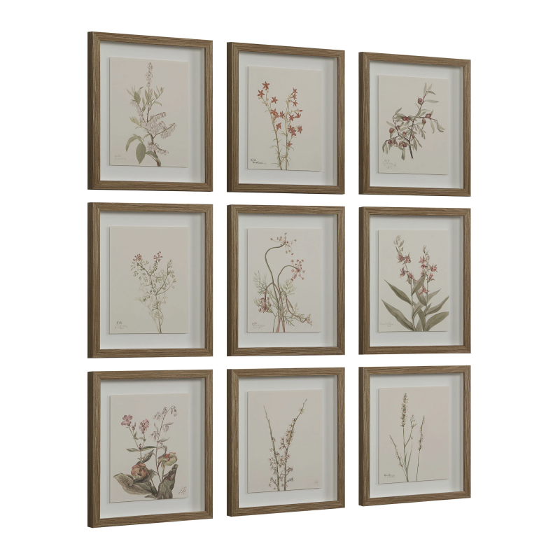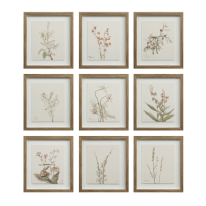 Traditional style is guaranteed when you make this timeless set of botanical wall art part of your decorating scheme. Each of its walnut veneer-framed pieces is designed with a muted colour palette showcasing a variety of beautiful blooms. Hang this set as a grid of nine to make a big statement or break it down into smaller groups for multiple impacts. InStock:0 Retail CAD:$0