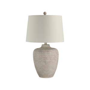 Embracing the earthenware trend is easy when you've got the stylish and affordable Albacete table lamp on display in a dining room, living room or bedroom. Sitting atop its chrome-plated fitting is a lovely oatmeal linen drum shade that diffuses ambient light throughout any space while its generously sized body features a hammered texture with an Irish cream finish that brings plenty of interest to any home. InStock:0 Retail CAD:$0