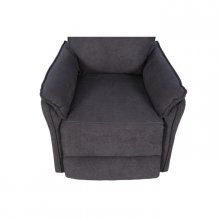 - Dark grey fabric upholstery with a trim profile, cushioned headrest, pillowy arms, and welted seams