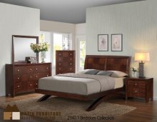 Contemporary Bedroom Collection featuring an upholstered Bed in Beige fabric and accented by case pieces with recessed drawers all finished in Medium Cherry.