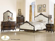 The Carrie Ann Collection. The warm cherry finish serves to highlight the raised parquet veneer pattern that graces the case goods and bed. Button tufted dark brown bi-cast vinyl covers the headboard.