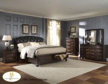 The Wrentham Collection. The rolled, wood framed, tufted black bonded leather headboard begins as the focal point of the offering. Fully functioning storage drawers on the footboard feature the same antique bronzed hardware that accents each of the case pieces.