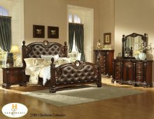 The Orleans Collection. Acanthus leaf carvings feature prominently and blend with elegantly appointed moldings on each piece. Wreath accents lend dramatic flair to the bed and mirror as does the scultpted lion's foot base, supporting each pieces. Heavy pilasters rise with and are topped with carved finials on the tufted dark brown bonded leather headboard and footboard. A rich cherry finish with gold tipping completes the formal feel of this collection.