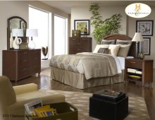 The Beaumont Collection. Contemporary route lines give way to rounded pilasters on the case pieces, while carrying over the framed bed. Satin nickel hardware follows the lines of each piece. Cherry veneers and the high pressure laminate tops are finished in a medium brown cherry.
